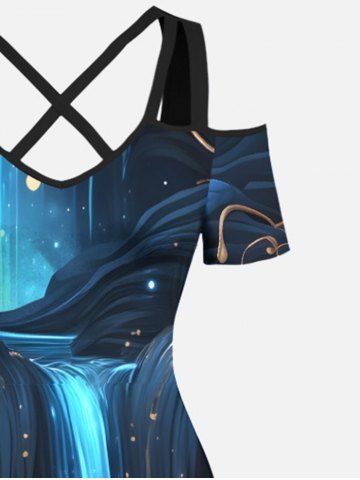 Plus Size Rose Flower Fall Galaxy Print Hawaii Cold Shoulder Crisscross A Line Maxi Dress - Navy Blue - Xxs