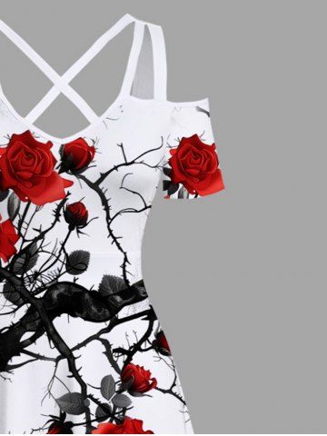 Plus Size Rose Flower Leaf Branch Print Cold Shoulder Crisscross Hawaii Maxi Dress - White - 4x