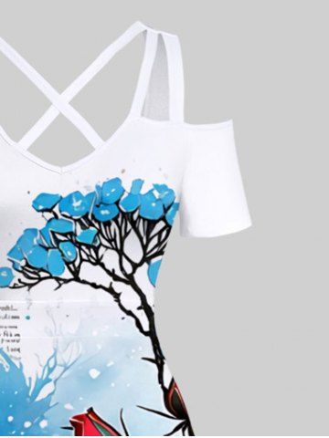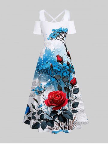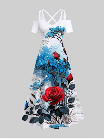 Plus Size Rose Flower Leaf Butterfly Newspaper Print Cold Shoulder Crisscross Hawaii Maxi Dress - White - 4x