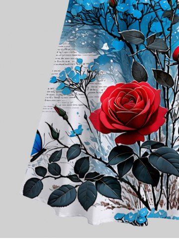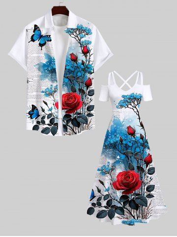 Graphic Dresses > Plus Size Rose Flower Leaf Butterfly Newspaper Print Cold Shoulder Crisscross Hawaii Maxi Dress