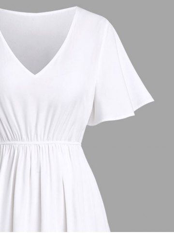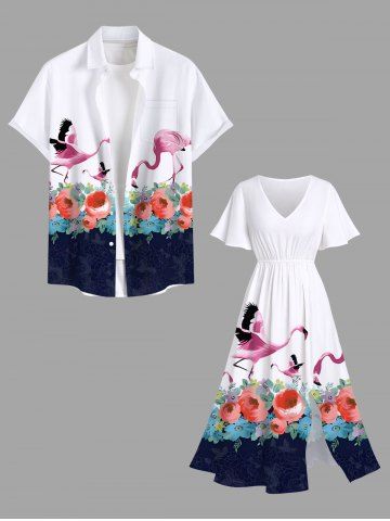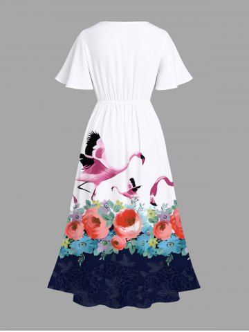 Plus Size Rose Flower Leaf Flamingo Print Hawaii Split Pocket A Line Midi Dress - White - Xs