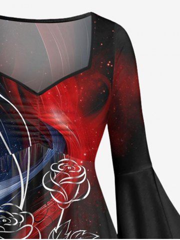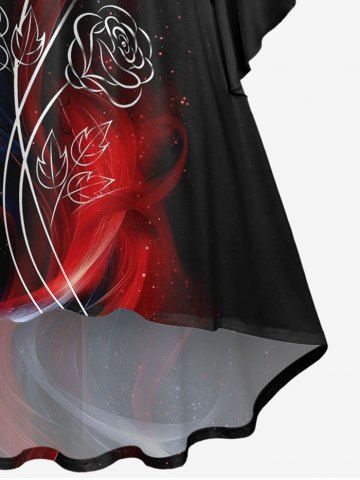 Graphic Dresses > Plus Size Rose Flower Leaf Galaxy Light Beam 3D Print Ruched Flare Sleeves High Low Dress