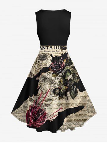 Plus Size Rose Flower Leaf Newspaper Print 1950s Vintage Dress - Black - M