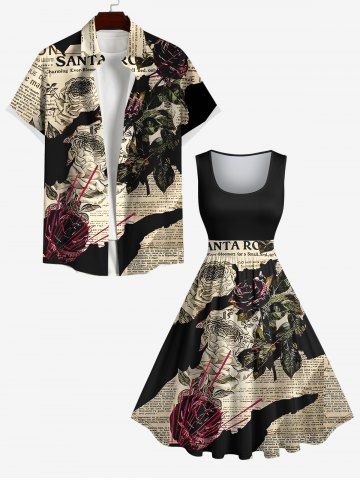 Plus Size Rose Flower Leaf Newspaper Print 1950s Vintage Dress - Black - 1x