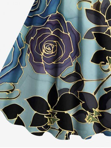 Plus Size Rose Flower Leaf Ombre Print Hawaii A Line Tank Dress - Sky Blue - S