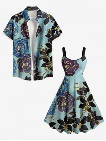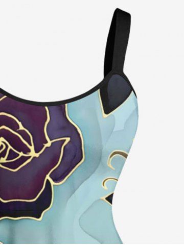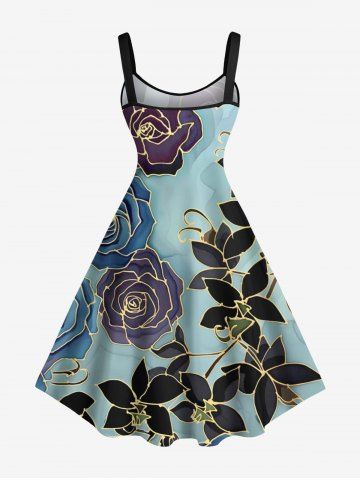 Plus Size Rose Flower Leaf Ombre Print Hawaii A Line Tank Dress - Sky Blue - 2x