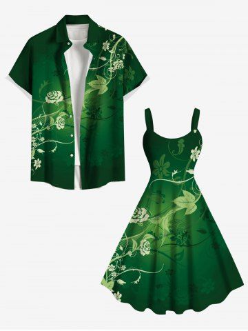 Plus Size Rose Flower Leaf Ombre Print Hawaii Tank Dress - Green - Xs