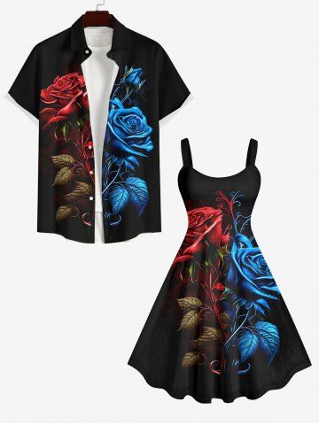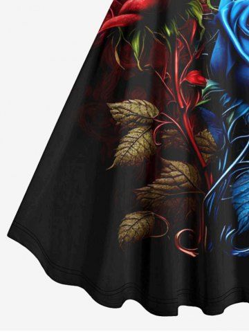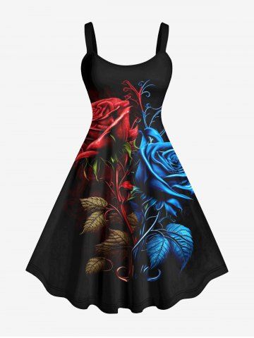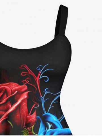 Plus Size Rose Flower Leaf Print Hawaii A Line Tank Dress - Black - L