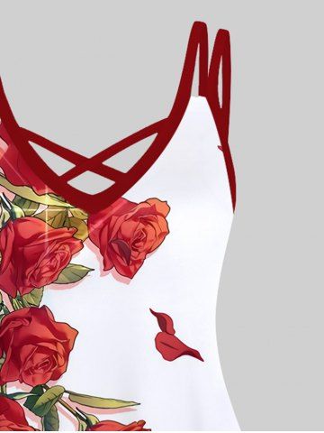 Plus Size Rose Flower Leaf Print Hawaii Crisscross A Line Cami Dress - White - 3x
