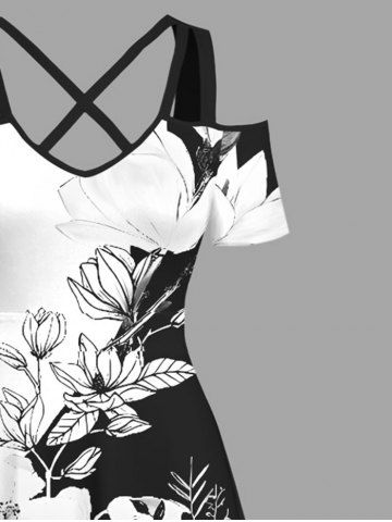 Plus Size Rose Flower Leaf Two Tone Print Hawaii Cold Shoulder Crisscross A Line Maxi Dress - White - 4x