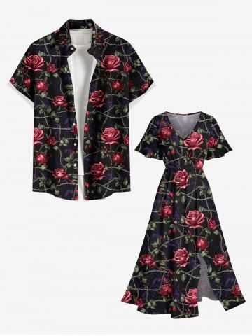Plus Size Rose Flower Leaf Vine Branch Print Hawaii Valentines Split Pocket A Line Midi Dress - Black - Xs