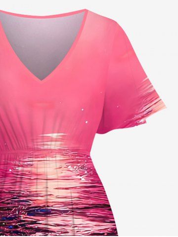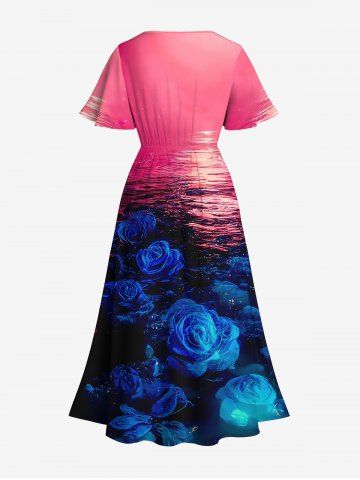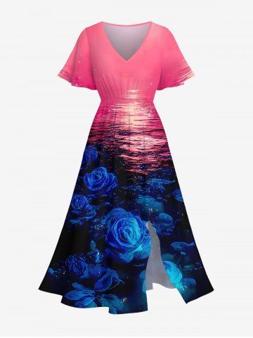 Plus Size Rose Flower Sea Glitter Midnight Print Hawaii Ombre Split Pocket A Line Midi Dress - Multi-a - 2x