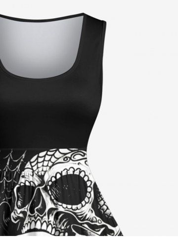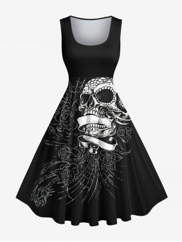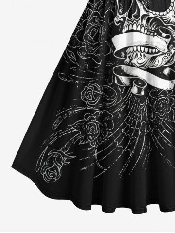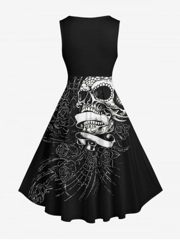 Plus Size Rose Flower Skull Spider Web Print Hawaii 1950s Vintage Dress - Black - M