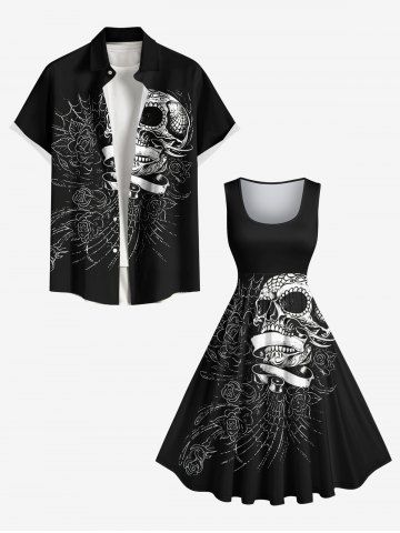 Plus Size Rose Flower Skull Spider Web Print Hawaii 1950s Vintage Dress - Black - 4x