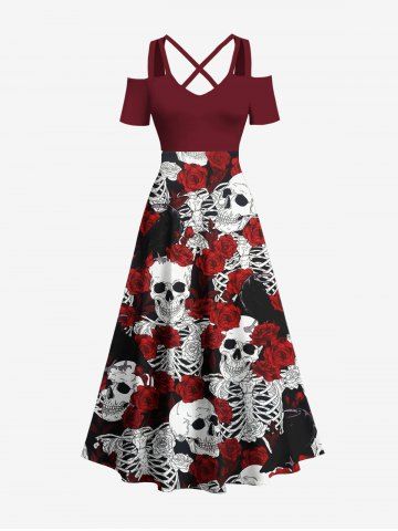 Plus Size Rose Flower Skulls Skeleton Print Cold Shoulder Crisscross Hawaii Maxi Dress - Red - 5x