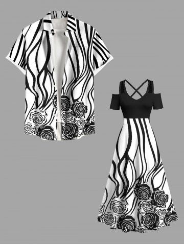 Plus Size Rose Flower Zebra Striped Print Hawaii Cold Shoulder Crisscross A Line Maxi Dress - White - 1x