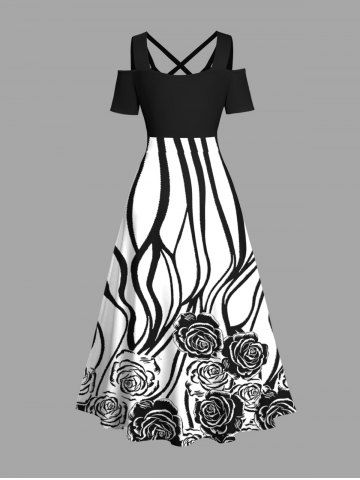 Graphic Dresses > Plus Size Rose Flower Zebra Striped Print Hawaii Cold Shoulder Crisscross A Line Maxi Dress