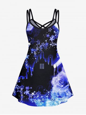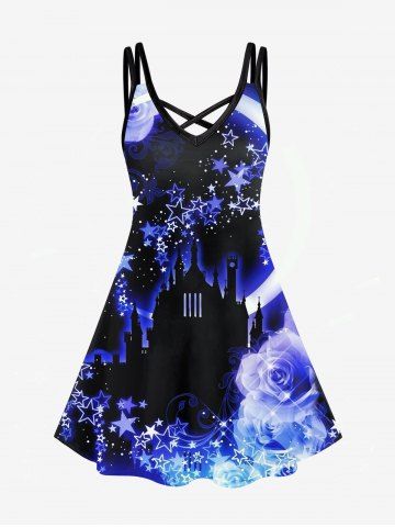 Graphic Dresses > Plus Size Rose Stars Castle Print Crisscross A Line Dress