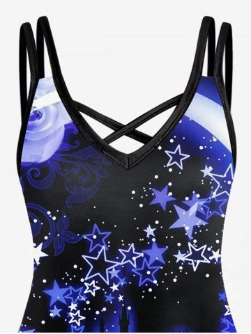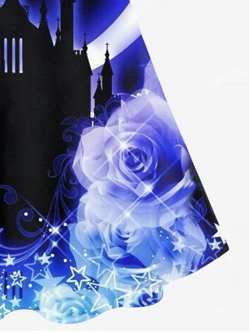 Plus Size Rose Stars Castle Print Crisscross A Line Dress - Deep Blue - 4x | Us 26-28