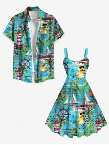 Plus Size Rudder Watchtower Ship Cool Duck Tropical Leaves Print Hawaii Ombre Cruise A Line Dress - Light Green - M