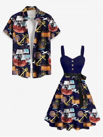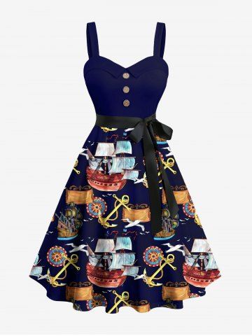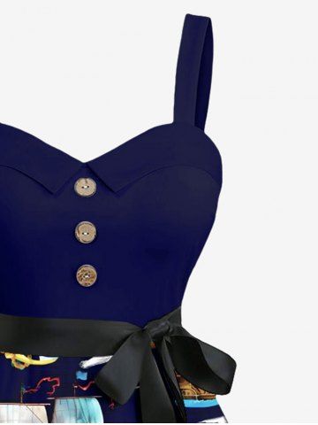 Plus Size Sailboat Anchor Print Hawaii Cruise Button A Line Tank Dress with Removable Belt - Black - S