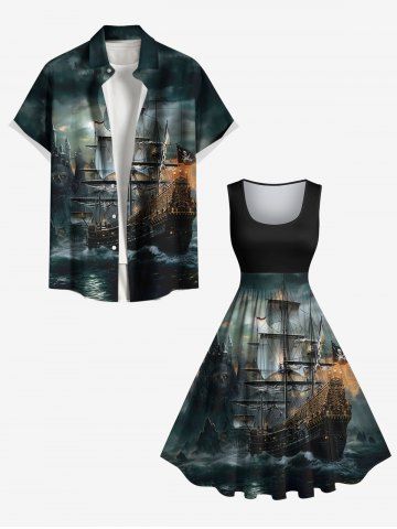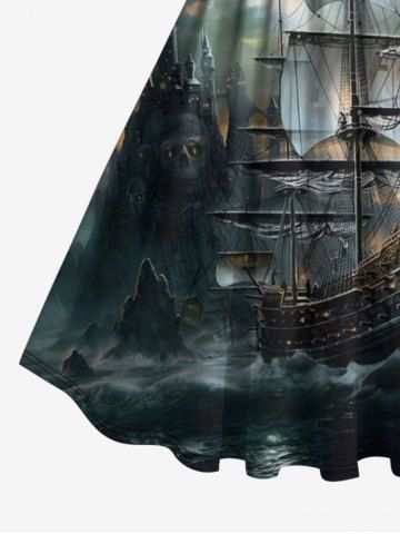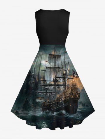 Plus Size Sailboat Castle Sea Waves Print Hawaii Cruise 1950s Vintage Dress - Black - S