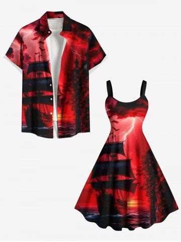 Plus Size Sailboat Sea Lightning Ombre Galaxy Print Hawaii Cruise A Line Dress - Red - 3x