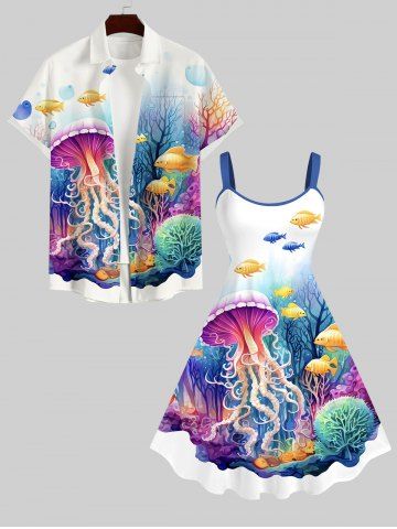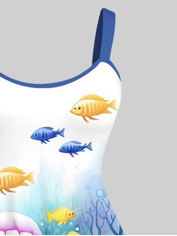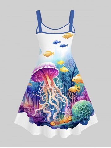 Plus Size Sailor Coral Fish Colorful Underwater World Print Hawaii Sea Creatures Backless A Line Tank Dress - White - 2x