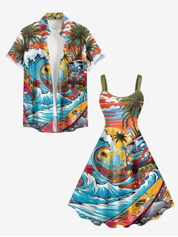 Graphic Dresses > Plus Size Sea Waves Coconut Tree Flower Bus Sun Print Hawaii Tank Dress