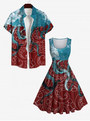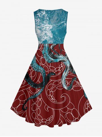 Graphic Dresses > Plus Size Sea Waves Octopus Colorblock Print Vintage Dress