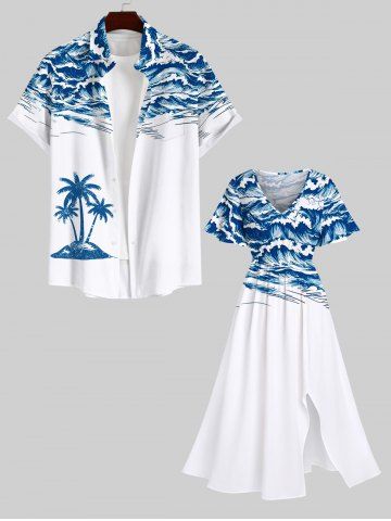Plus Size Sea Waves Print Hawaii Split Pocket A Line Midi Dress - White - L