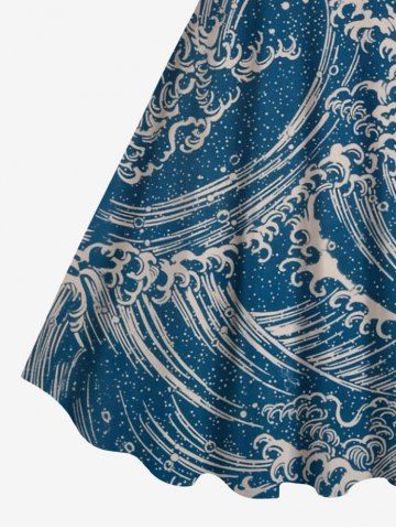 Plus Size Sea Waves Retro Pattern Print Hawaii Cruise Tank Dress - Deep Blue - S