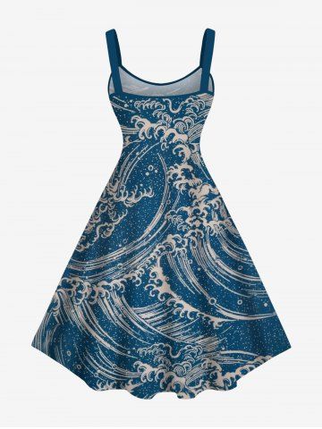 Plus Size Sea Waves Retro Pattern Print Hawaii Cruise Tank Dress - Deep Blue - 5x