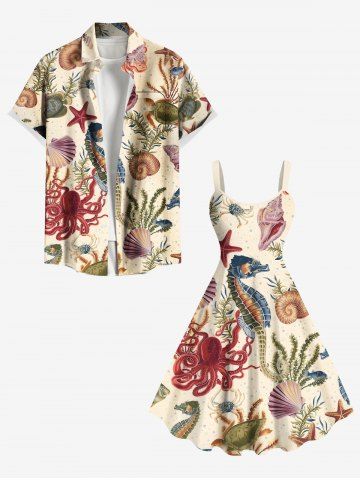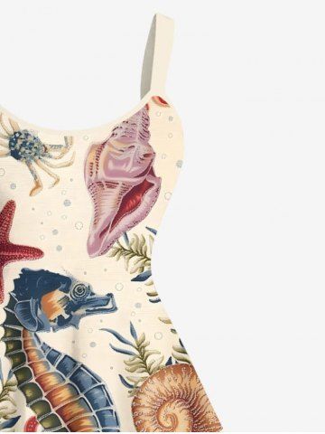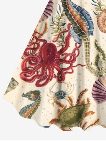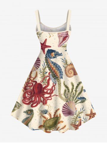 Plus Size Seahorse Starfish Water Grass Shell Octopus Turtle Print Hawaii Sea Creatures A Line Dress - Light Coffee - 1x