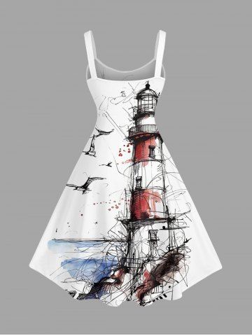 Plus Size Seascape Bird Light House Graffiti Print Hawaii Tank Dress - White - 1x