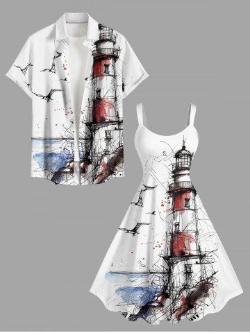 Graphic Dresses > Plus Size Seascape Bird Light House Graffiti Print Hawaii Tank Dress