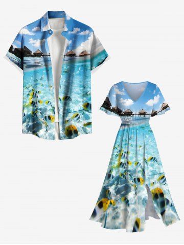 Plus Size Seascape Fish Cloud Bridge Print Split Hawaii Midi Dress - Light Blue - 3x