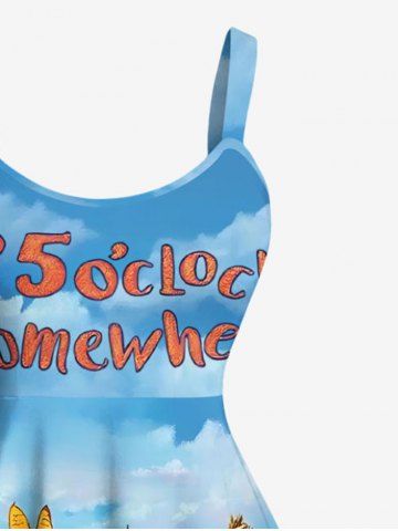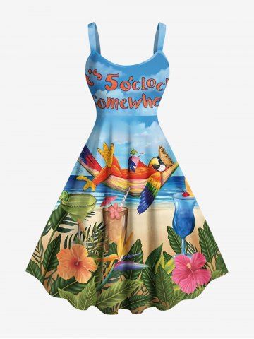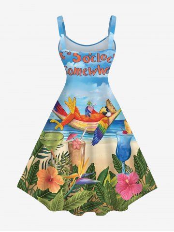 Plus Size Seascape Hibiscus Flower Leaf Juice Parrot Hammock Print Hawaii Tank Dress - Sky Blue - 4x