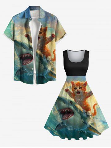 Plus Size Shark Cat Sea Waves Print Hawaii Vintage Swing A Line Dress - Black - S