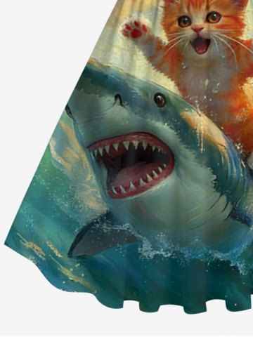 Graphic Dresses > Plus Size Shark Cat Sea Waves Print Hawaii Vintage Swing A Line Dress