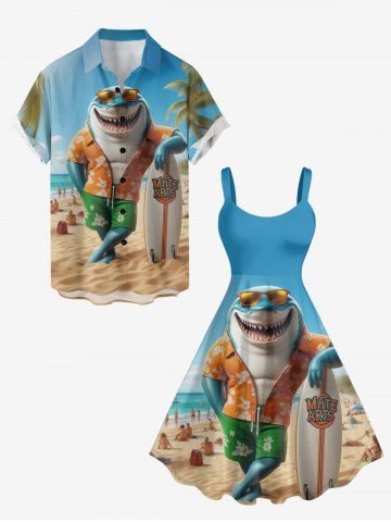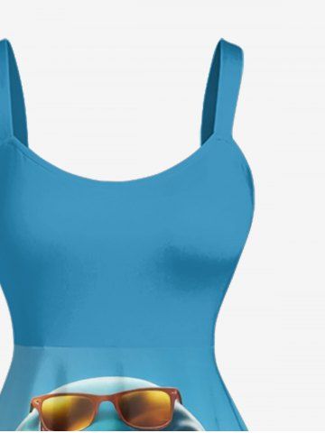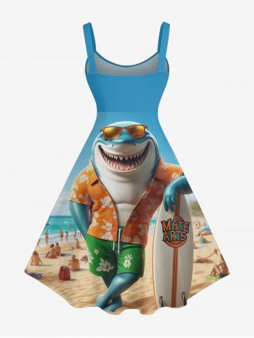 Plus Size Shark Coconut Tree Beach Seascape Print Hawaii Tank Dress - Sky Blue - Xs