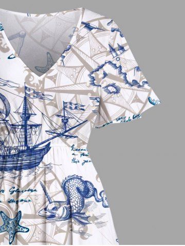 Plus Size Ship Anchor Steering Wheel Print Hawaii Split Pocket A Line Midi Dress - Blue - 2x