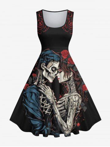 Graphic Dresses > Plus Size Skeleton Lovers Rose Flower Print Vintage Swing A Line Dress