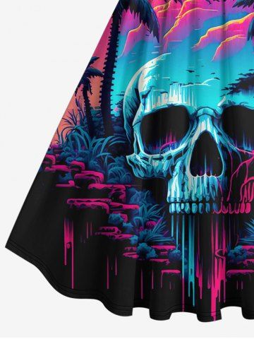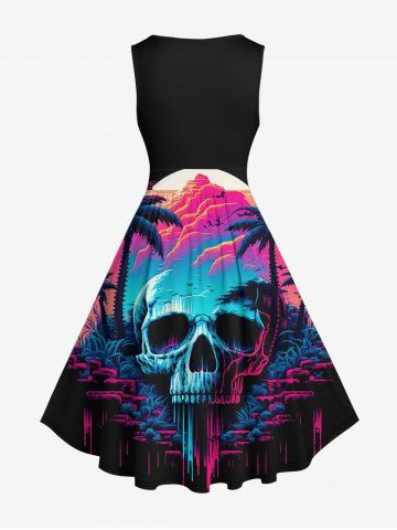 Plus Size Skull Cave Coconut Tree Mountain Print 1950s Hawaii Vintage Swing A Line Dress - Black - 1x