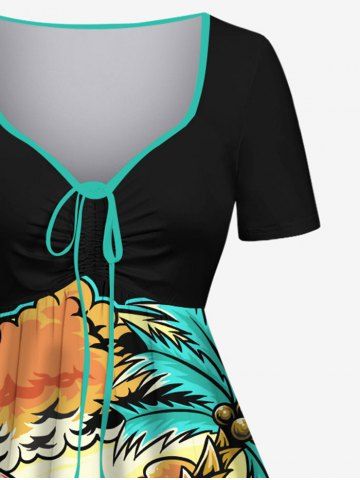 Plus Size Skull Coconut Tree Sea Beach Print Hawaii Cinched A Line Dress - Black - L