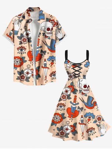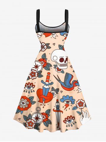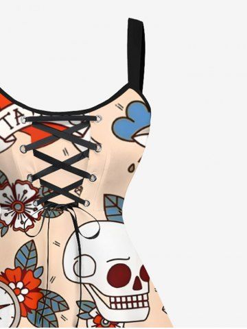 Plus Size Skull Floral Clock Sword Heart Bird Print Hawaii Lace Up A Line Tank Dress - Apricot - Xxs