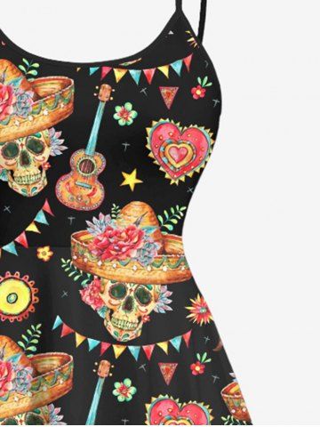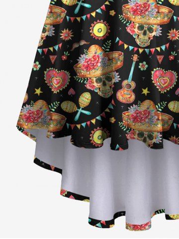 Plus Size Skull Flower Hat Guitar Heart Candy Print Hawaii Campfire Hula Dance High Low Asymmetric Cami Dress - Black - 5x
