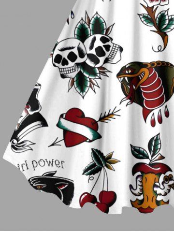 Plus Size Skull Flower Heart Snake Cherry Print A Line Tank Dress - White - M
