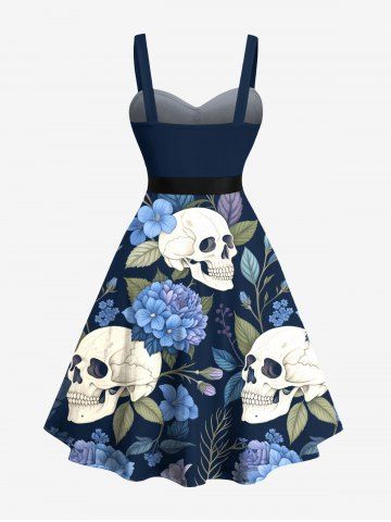 Graphic Dresses > Plus Size Skull Flower Leaf Branch Print Button A Line Dress with Removable Belt