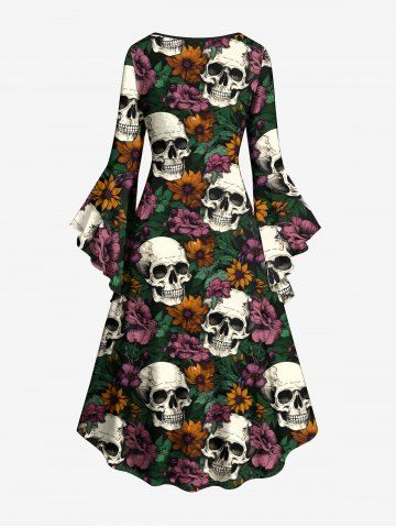Plus Size Skull Flower Print Hawaii Ruched High Low Asymmetric Dress - Deep Green - 5x